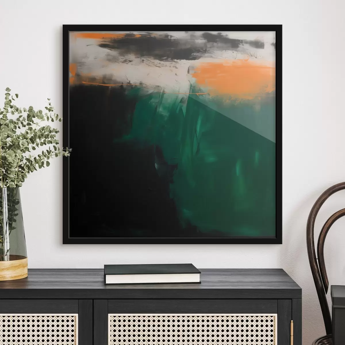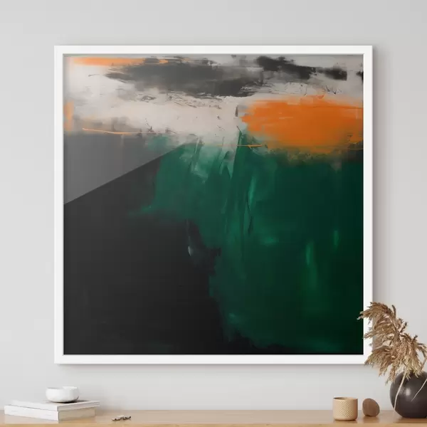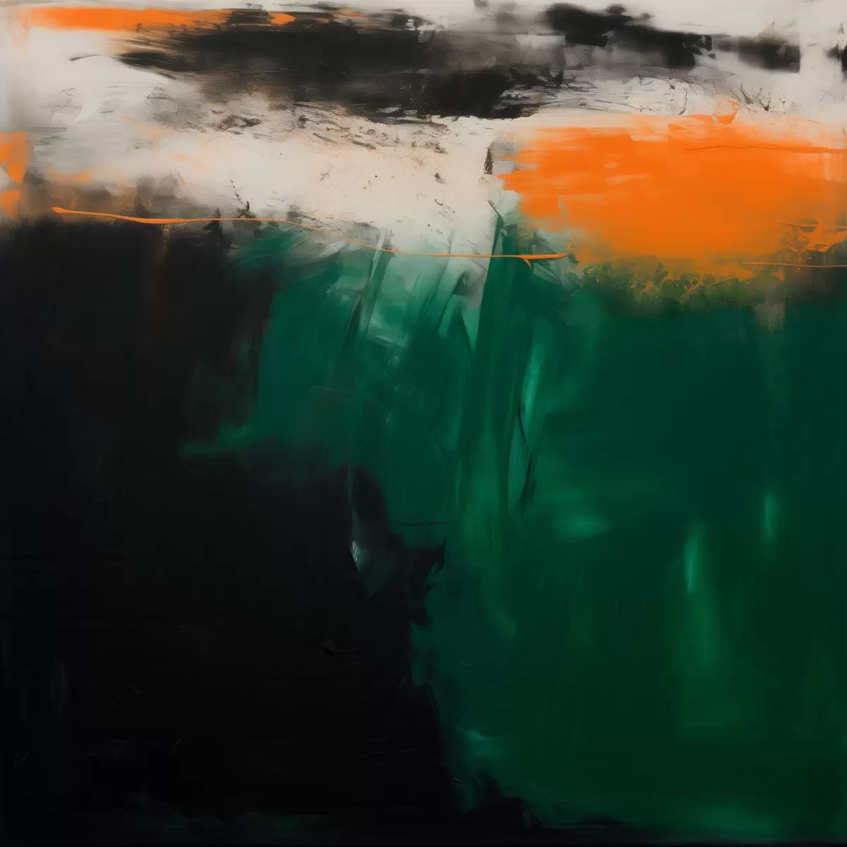 Plakat Abstrakcja z pomarańczowymi akcentami i ciemnozielonymi pociągnięciami pędzla w nowoczesnym stylu malarskim f48865