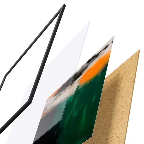 Plakat składa się z ramy, pleksi, wydrukowanego obrazu i podkładu z płyty wiórowej. Plakat można natychmiast zawiesić na ścianie dzięki uchwytom z tyłu.