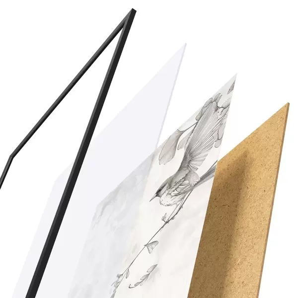 Plakat składa się z ramy, pleksi, wydrukowanego obrazu i podkładu z płyty wiórowej. Plakat można natychmiast zawiesić na ścianie dzięki uchwytom z tyłu.