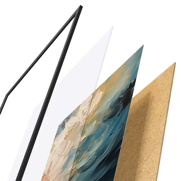 Plakat składa się z ramy, pleksi, wydrukowanego obrazu i podkładu z płyty wiórowej. Plakat można natychmiast zawiesić na ścianie dzięki uchwytom z tyłu.