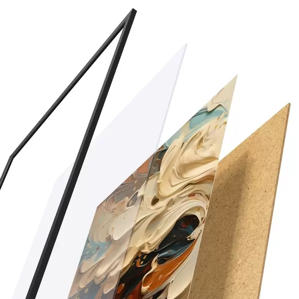 Plakat składa się z ramy, pleksi, wydrukowanego obrazu i podkładu z płyty wiórowej. Plakat można natychmiast zawiesić na ścianie dzięki uchwytom z tyłu.