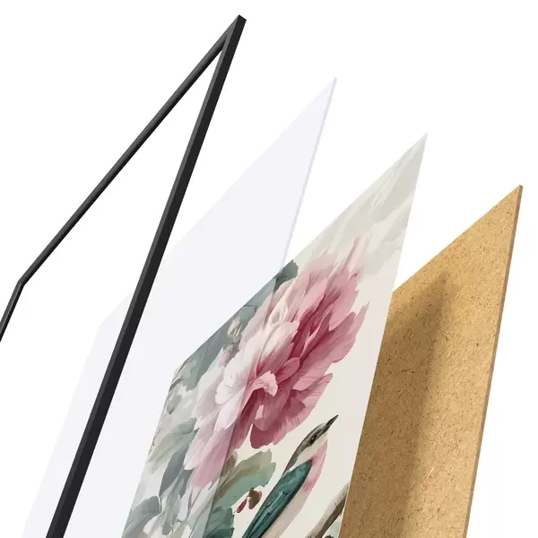 Plakat składa się z ramy, pleksi, wydrukowanego obrazu i podkładu z płyty wiórowej. Plakat można natychmiast zawiesić na ścianie dzięki uchwytom z tyłu.