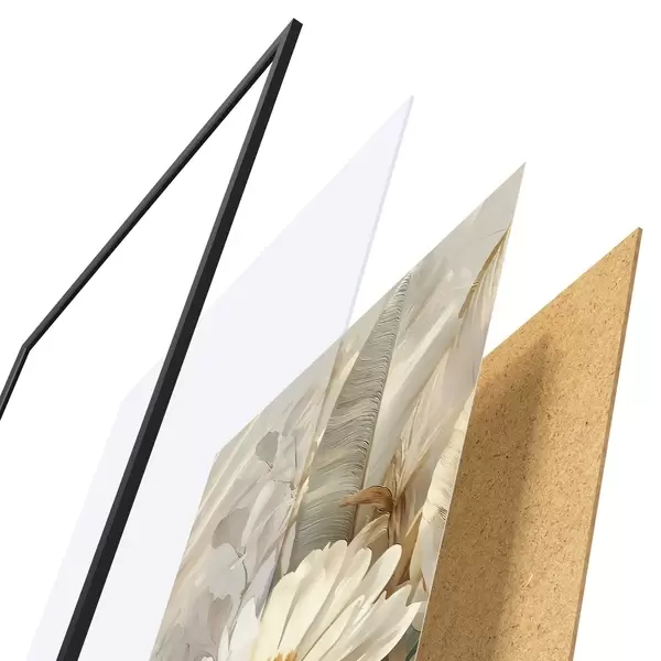 Plakat składa się z ramy, pleksi, wydrukowanego obrazu i podkładu z płyty wiórowej. Plakat można natychmiast zawiesić na ścianie dzięki uchwytom z tyłu.