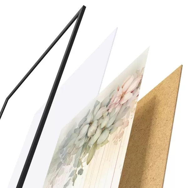 Plakat składa się z ramy, pleksi, wydrukowanego obrazu i podkładu z płyty wiórowej. Plakat można natychmiast zawiesić na ścianie dzięki uchwytom z tyłu.