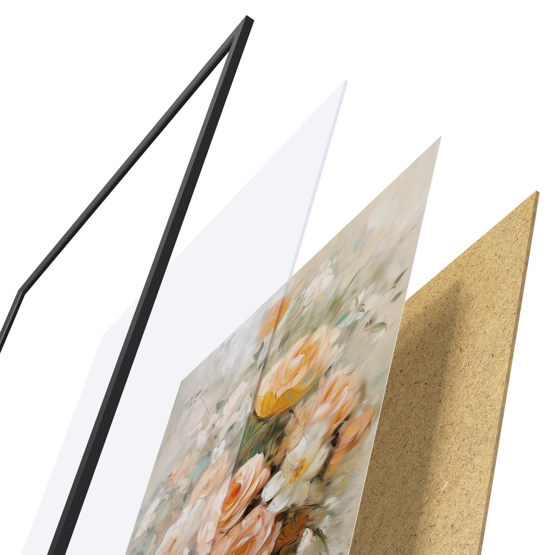 Plakat składa się z ramy, pleksi, wydrukowanego obrazu i podkładu z płyty wiórowej. Plakat można natychmiast zawiesić na ścianie dzięki uchwytom z tyłu.