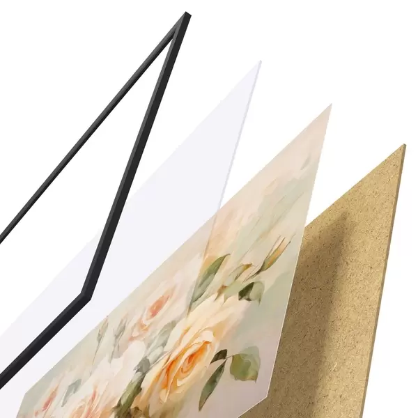 Plakat składa się z ramy, pleksi, wydrukowanego obrazu i podkładu z płyty wiórowej. Plakat można natychmiast zawiesić na ścianie dzięki uchwytom z tyłu.