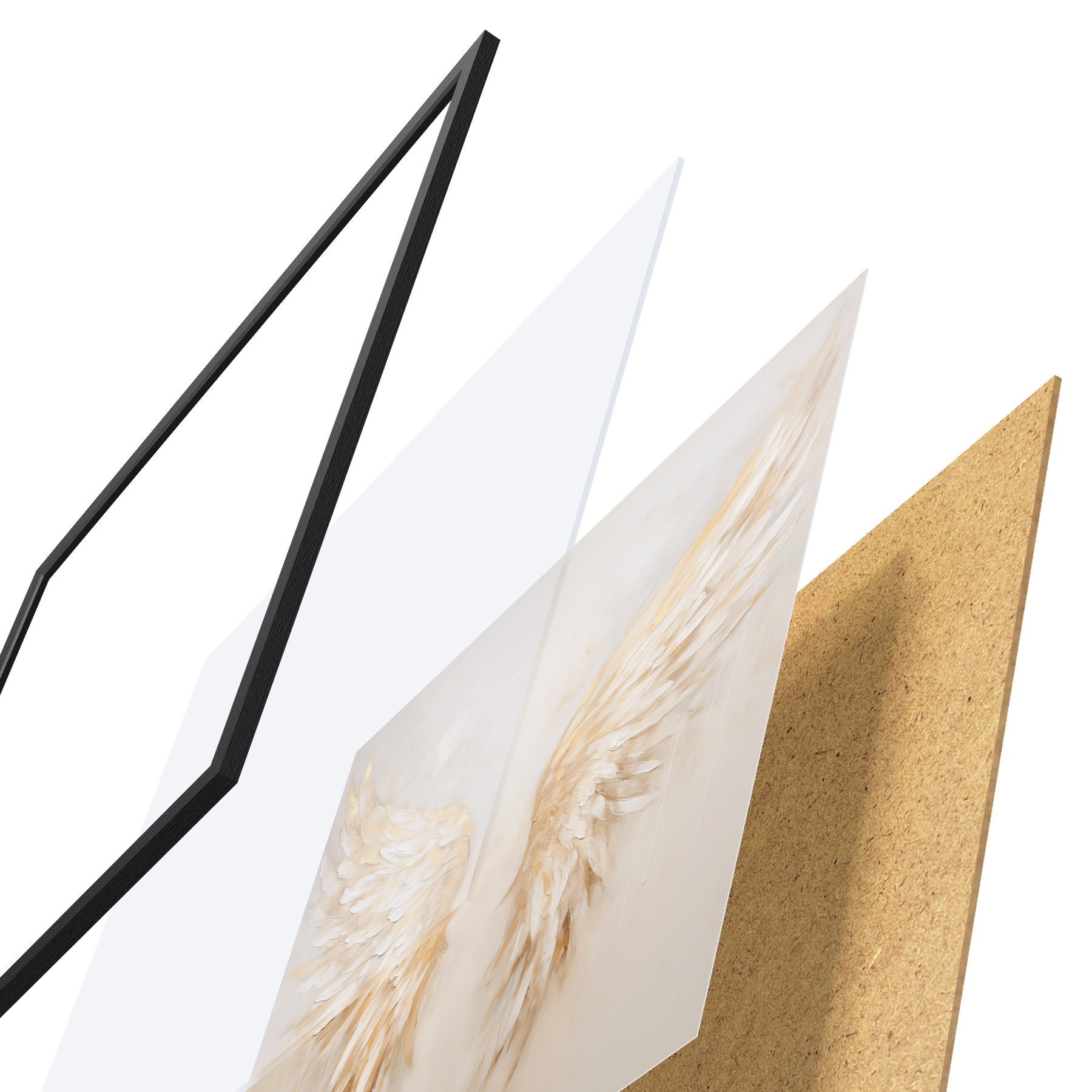 Plakat składa się z ramy, pleksi, wydrukowanego obrazu i podkładu z płyty wiórowej. Plakat można natychmiast zawiesić na ścianie dzięki uchwytom z tyłu.
