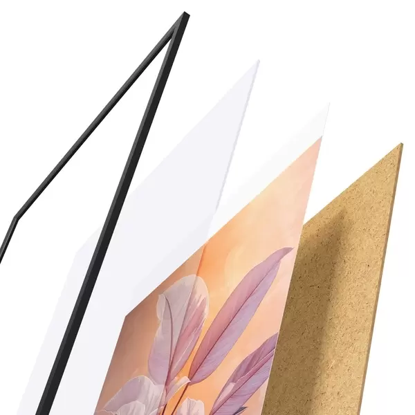 Plakat składa się z ramy, pleksi, wydrukowanego obrazu i podkładu z płyty wiórowej. Plakat można natychmiast zawiesić na ścianie dzięki uchwytom z tyłu.