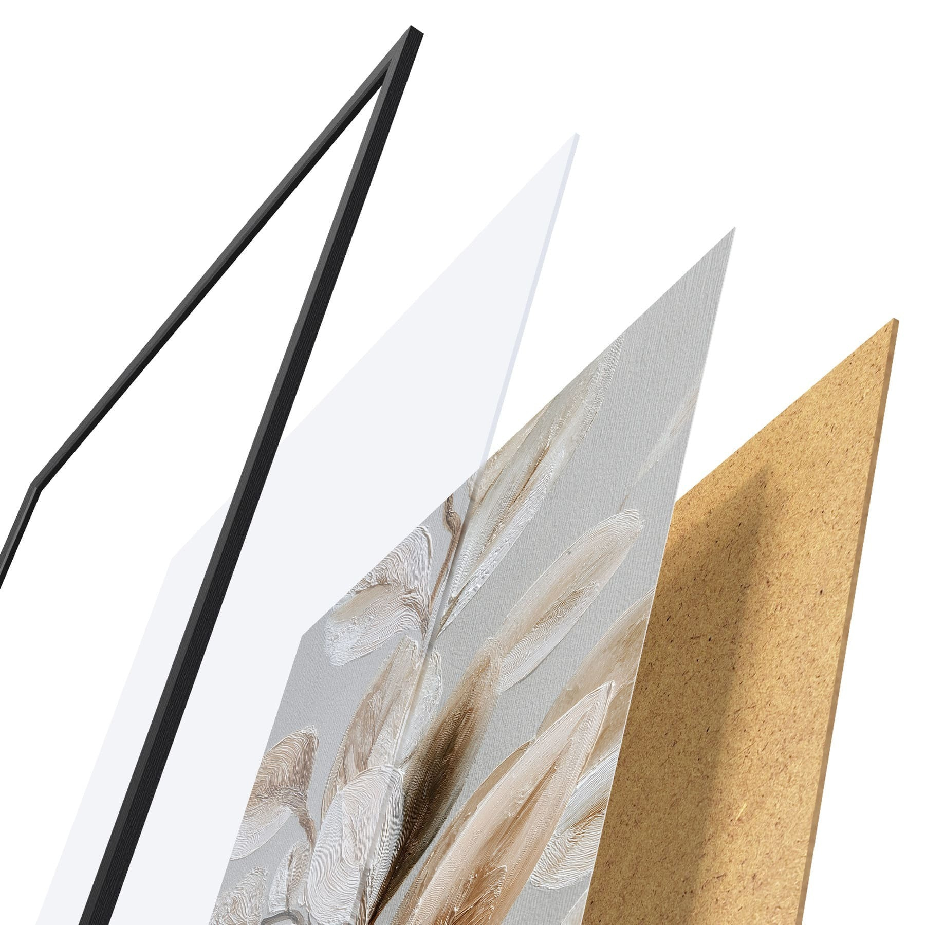Plakat składa się z ramy, pleksi, wydrukowanego obrazu i podkładu z płyty wiórowej. Plakat można natychmiast zawiesić na ścianie dzięki uchwytom z tyłu.