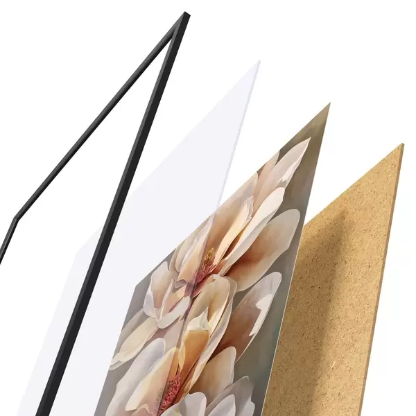 Plakat składa się z ramy, pleksi, wydrukowanego obrazu i podkładu z płyty wiórowej. Plakat można natychmiast zawiesić na ścianie dzięki uchwytom z tyłu.