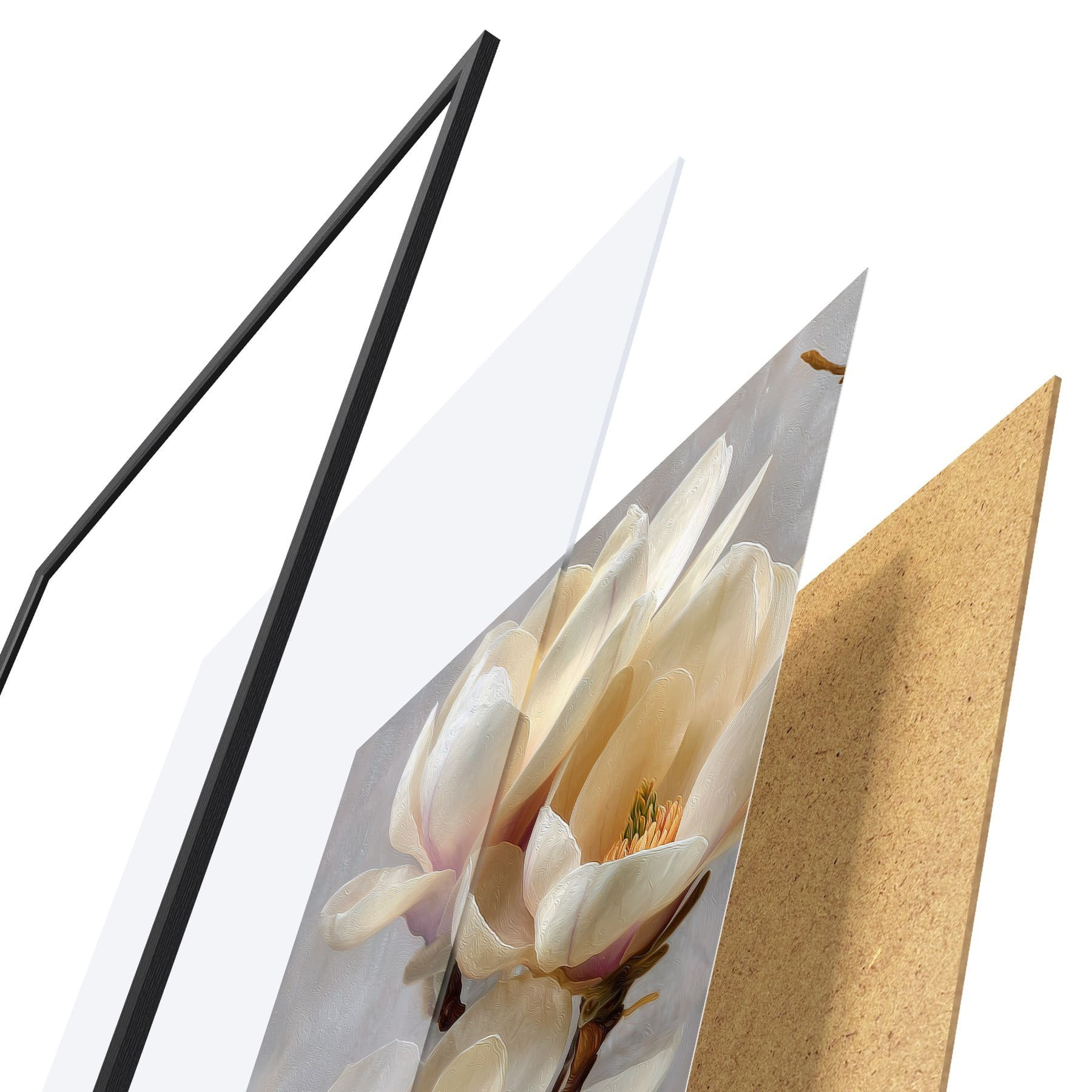 Plakat składa się z ramy, pleksi, wydrukowanego obrazu i podkładu z płyty wiórowej. Plakat można natychmiast zawiesić na ścianie dzięki uchwytom z tyłu.