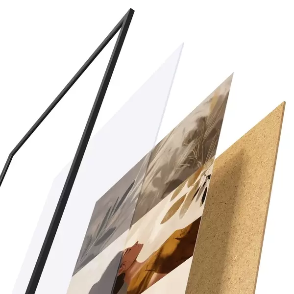 Plakat składa się z ramy, pleksi, wydrukowanego obrazu i podkładu z płyty wiórowej. Plakat można natychmiast zawiesić na ścianie dzięki uchwytom z tyłu.