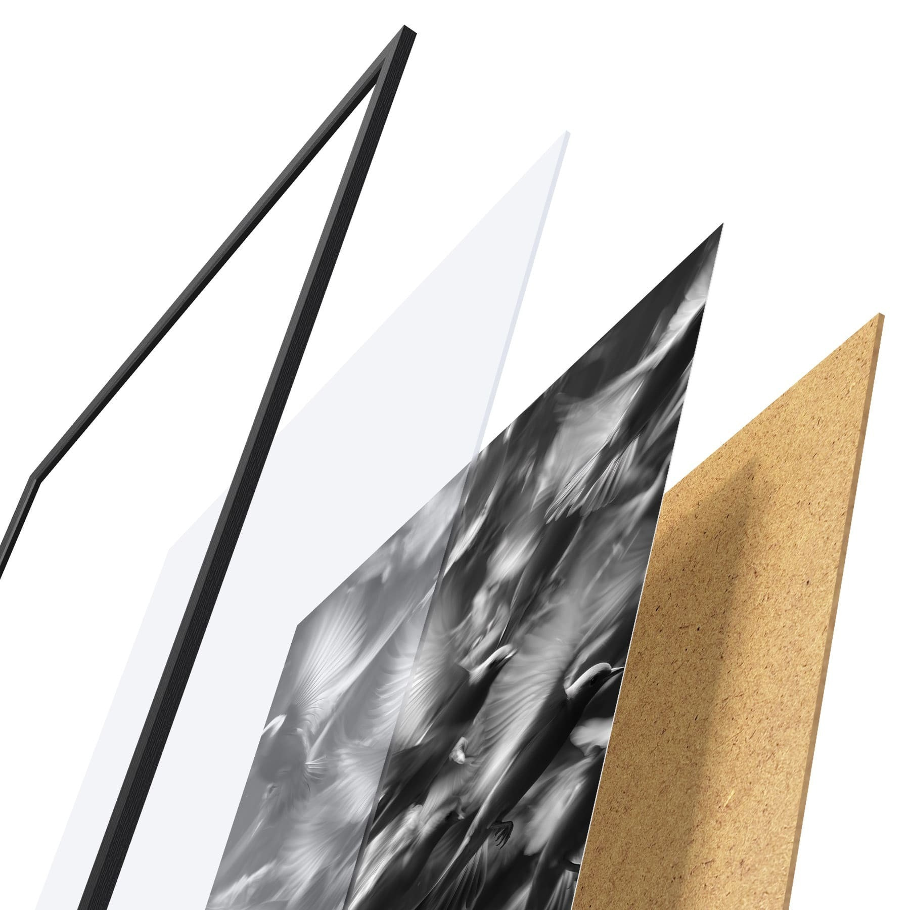 Plakat składa się z ramy, pleksi, wydrukowanego obrazu i podkładu z płyty wiórowej. Plakat można natychmiast zawiesić na ścianie dzięki uchwytom z tyłu.