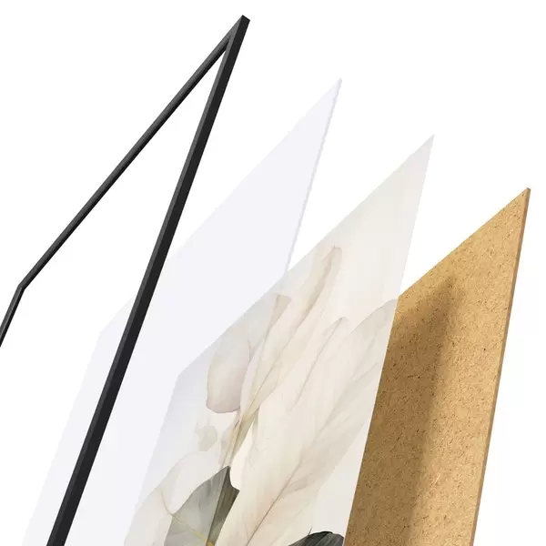 Plakat składa się z ramy, pleksi, wydrukowanego obrazu i podkładu z płyty wiórowej. Plakat można natychmiast zawiesić na ścianie dzięki uchwytom z tyłu.