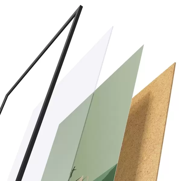 Plakat składa się z ramy, pleksi, wydrukowanego obrazu i podkładu z płyty wiórowej. Plakat można natychmiast zawiesić na ścianie dzięki uchwytom z tyłu.