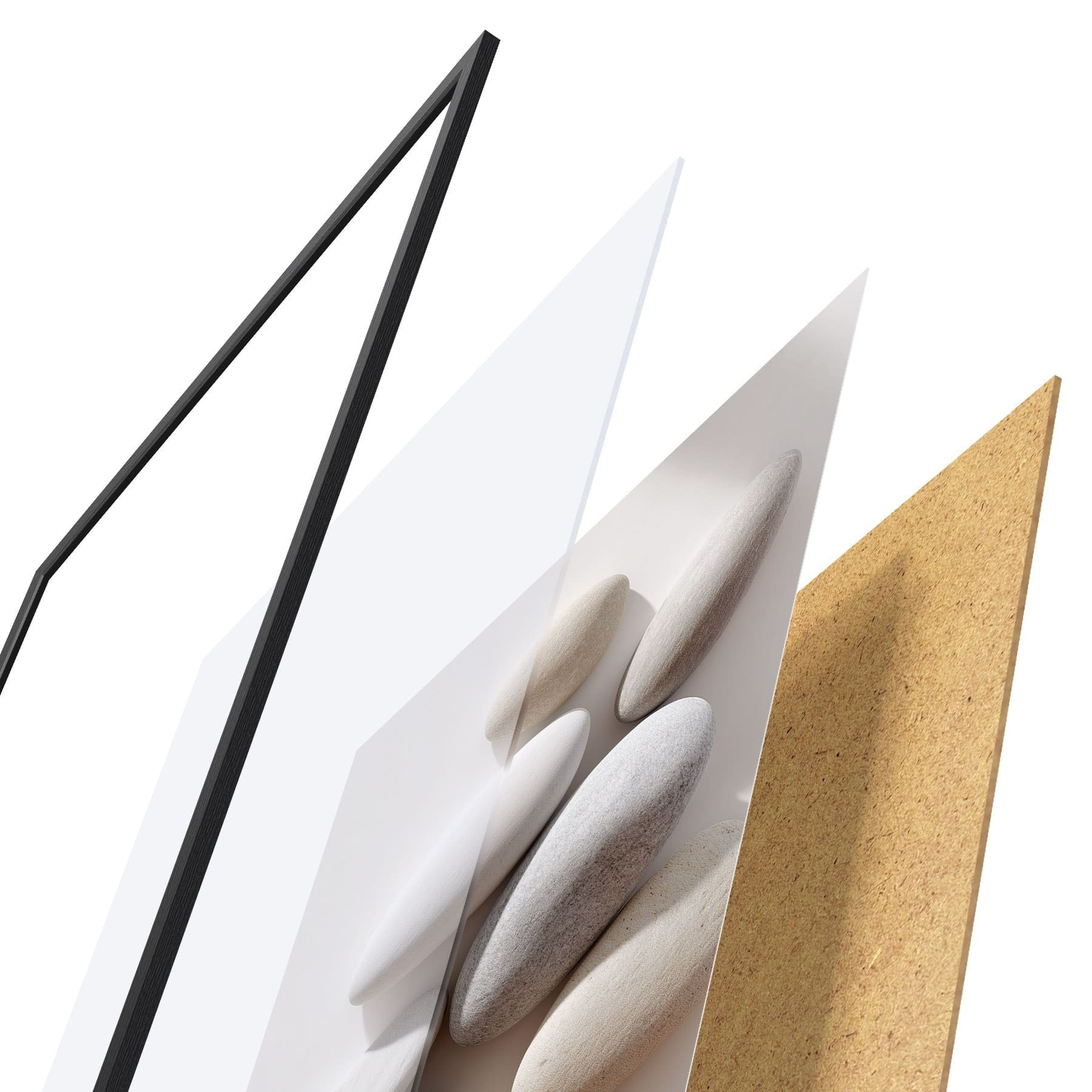 Plakat składa się z ramy, pleksi, wydrukowanego obrazu i podkładu z płyty wiórowej. Plakat można natychmiast zawiesić na ścianie dzięki uchwytom z tyłu.