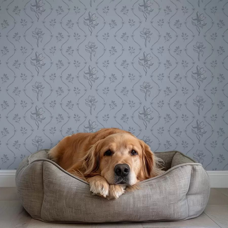 Stylizowane kwiaty na szaro-niebieskim tle, chłodna paleta barw