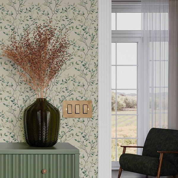 Jasne gałęzie z drobnymi kremowymi kwiatami i zielonymi liśćmi
