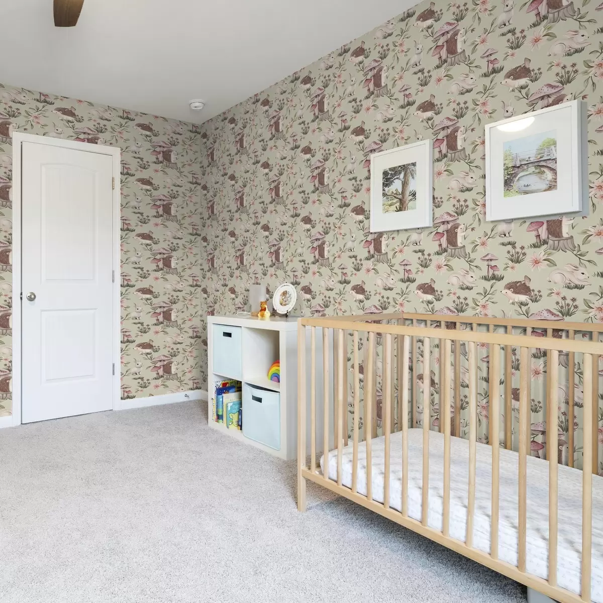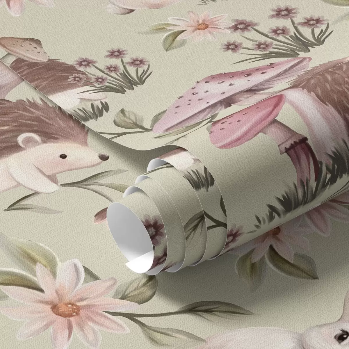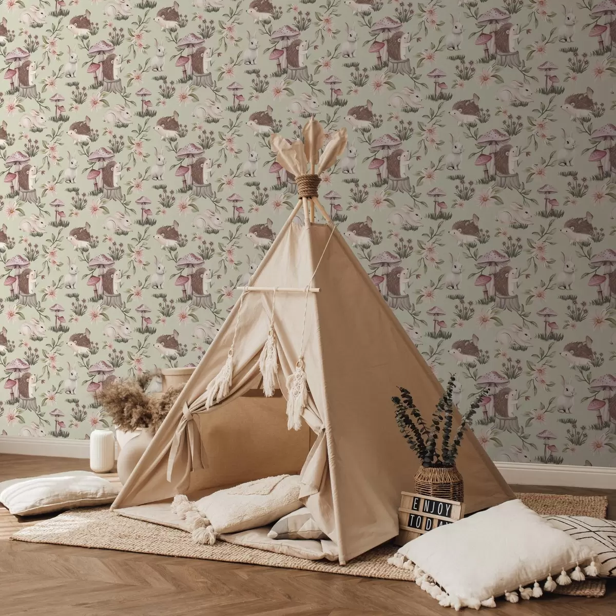 Tapety Bajkowe zwierzęta i kwiaty na zielonym tle w delikatnych pastelowych kolorach Nr. a00111v1