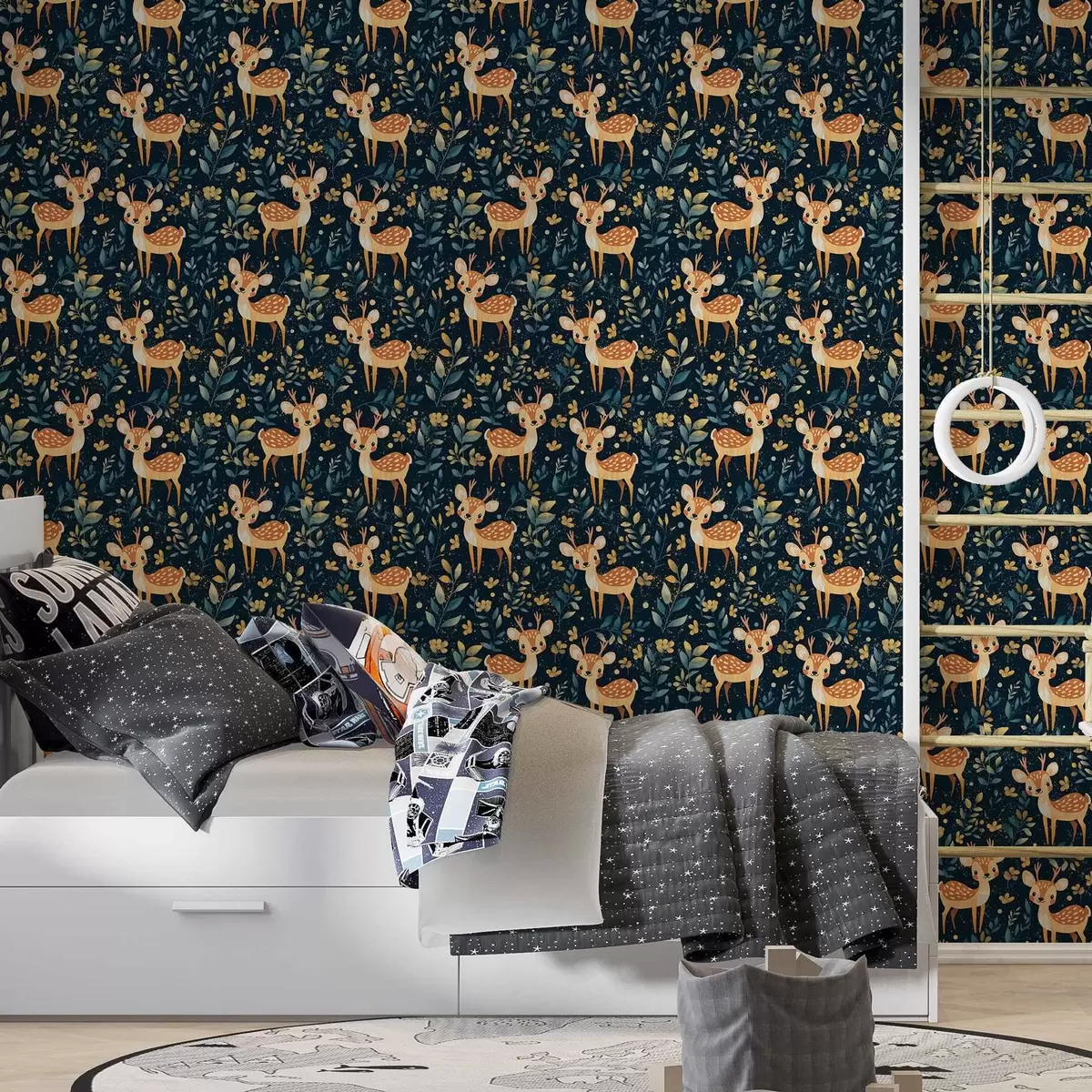 Tapety Jeleń w ciemnym lesie z żółtymi liśćmi Nr. a00124
