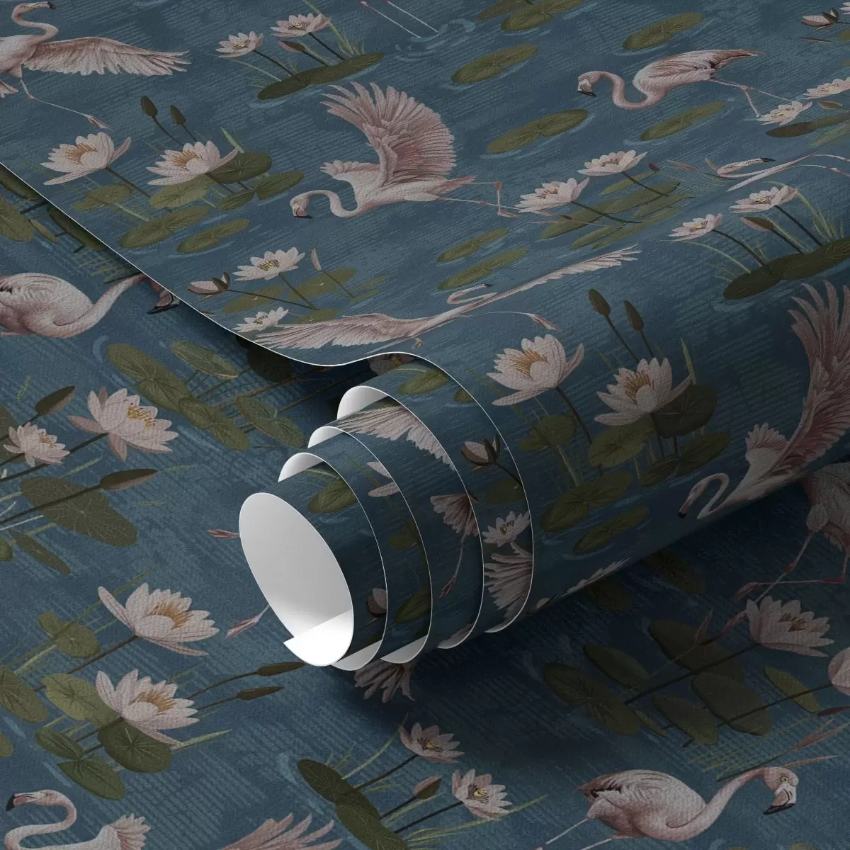 Tapety Flaming wśród lilii wodnych, tropikalna scena na granatowym tle Nr. a00237
