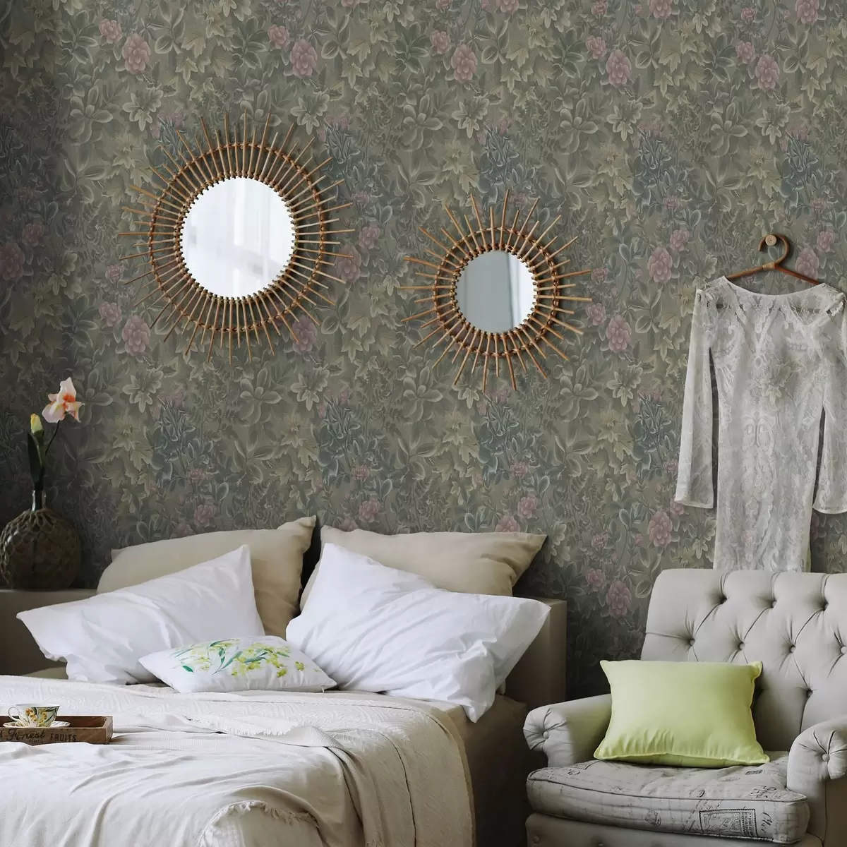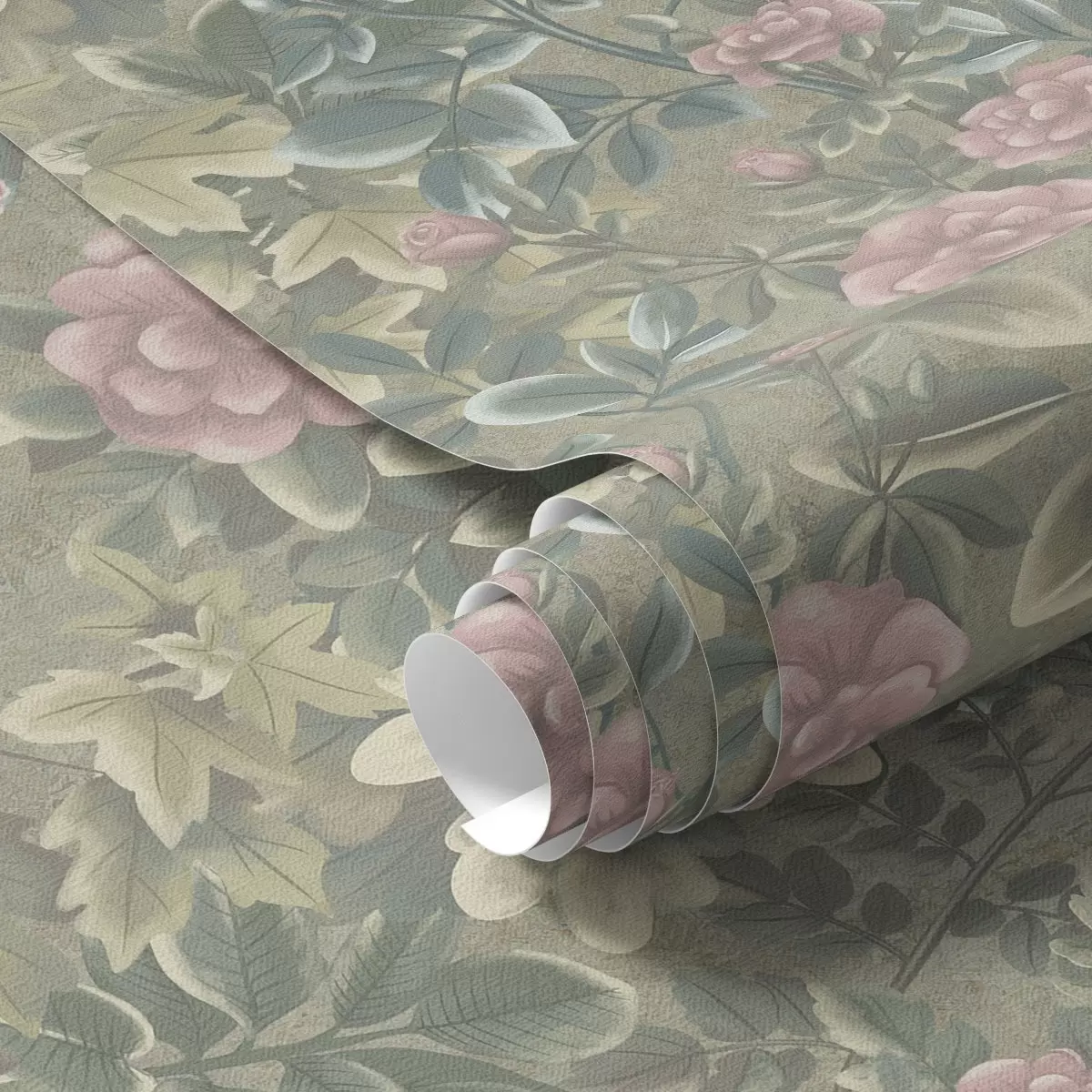 Tapety Różowe kwiaty i liście na pastelowym zielonym tle Nr. a00306