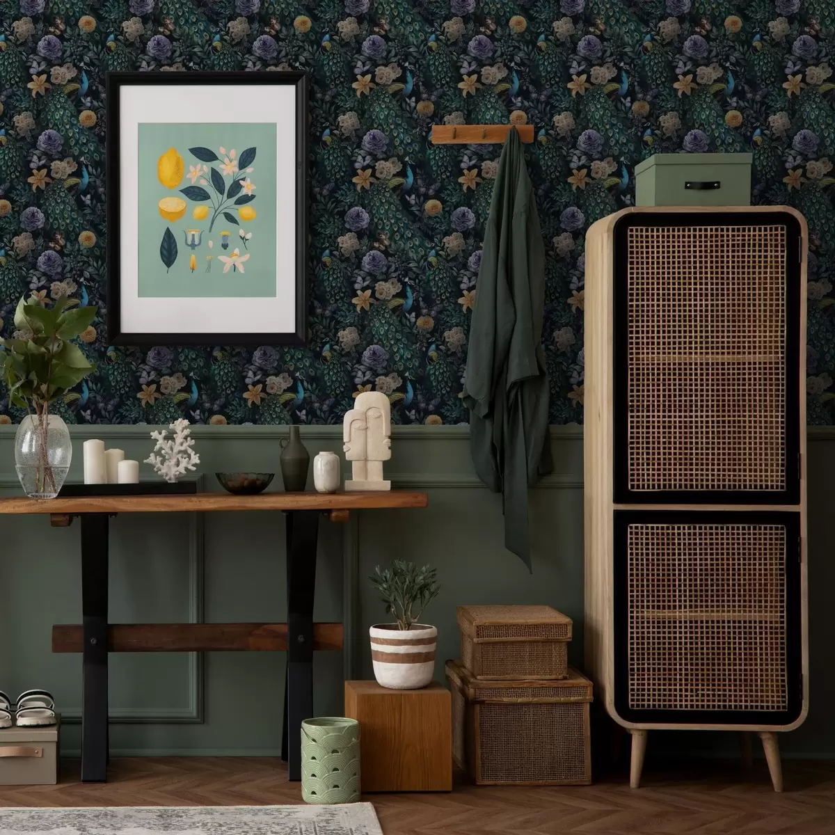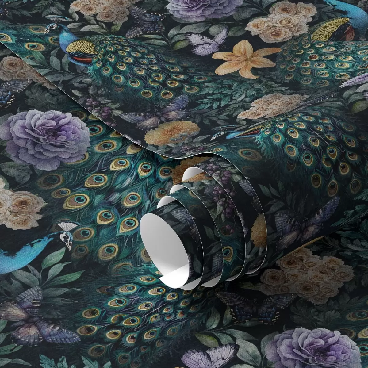 Tapety Pawie wśród ciemnych kwiatów i motyli Nr. a00348