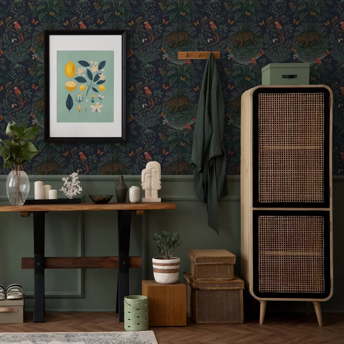 Tapety Tropikalna dżungla z lampartami, lampartami, papugami i motylami Nr. a00388