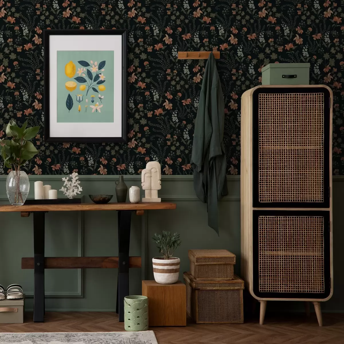Tapety Pomarańczowe lilie i małe kwiaty na czarnym tle Nr. a00463