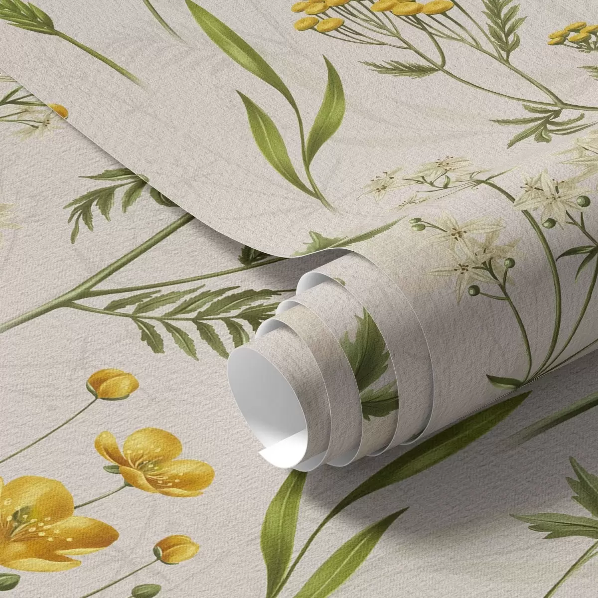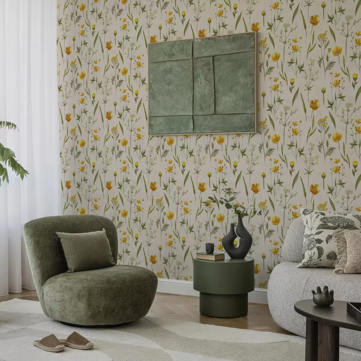 Tapety Żółte kwiaty i zieleń na beżowym tle Nr. a00472v2