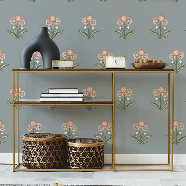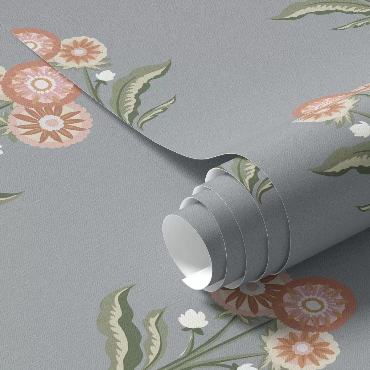 Tapety Stylizowane kwiaty na szaro-niebieskim tle, ciepła paleta barw Nr. a00494