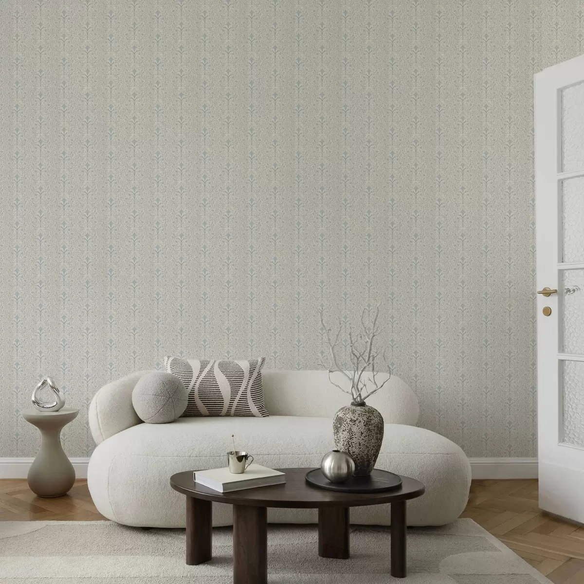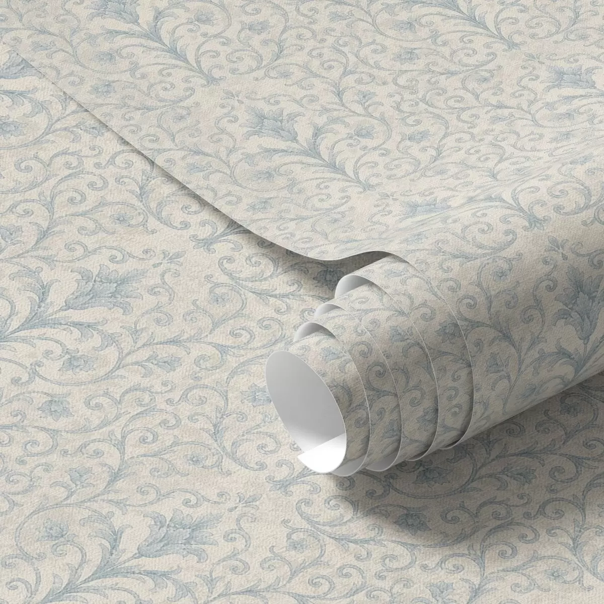 Tapety Niebieski adamaszek z zawijasami na kremowym tle Nr. a00578