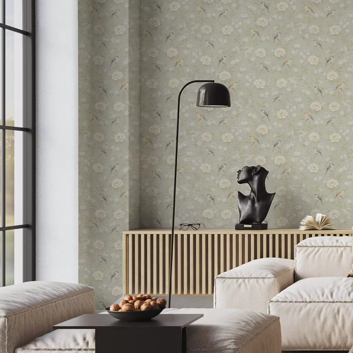 Tapety Ptaki wśród białych kwiatów na szaro-zielonym tle Nr. a00583