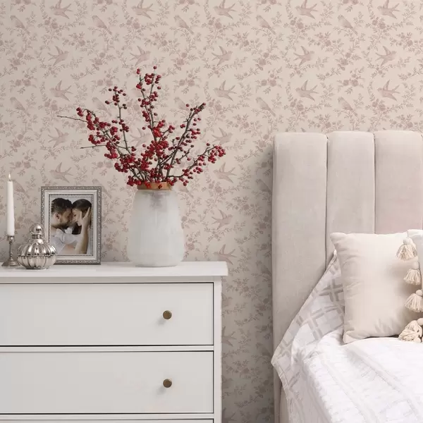 Tapety Ptaki i róże, wzór vintage na pudrowym różu Nr. a00587