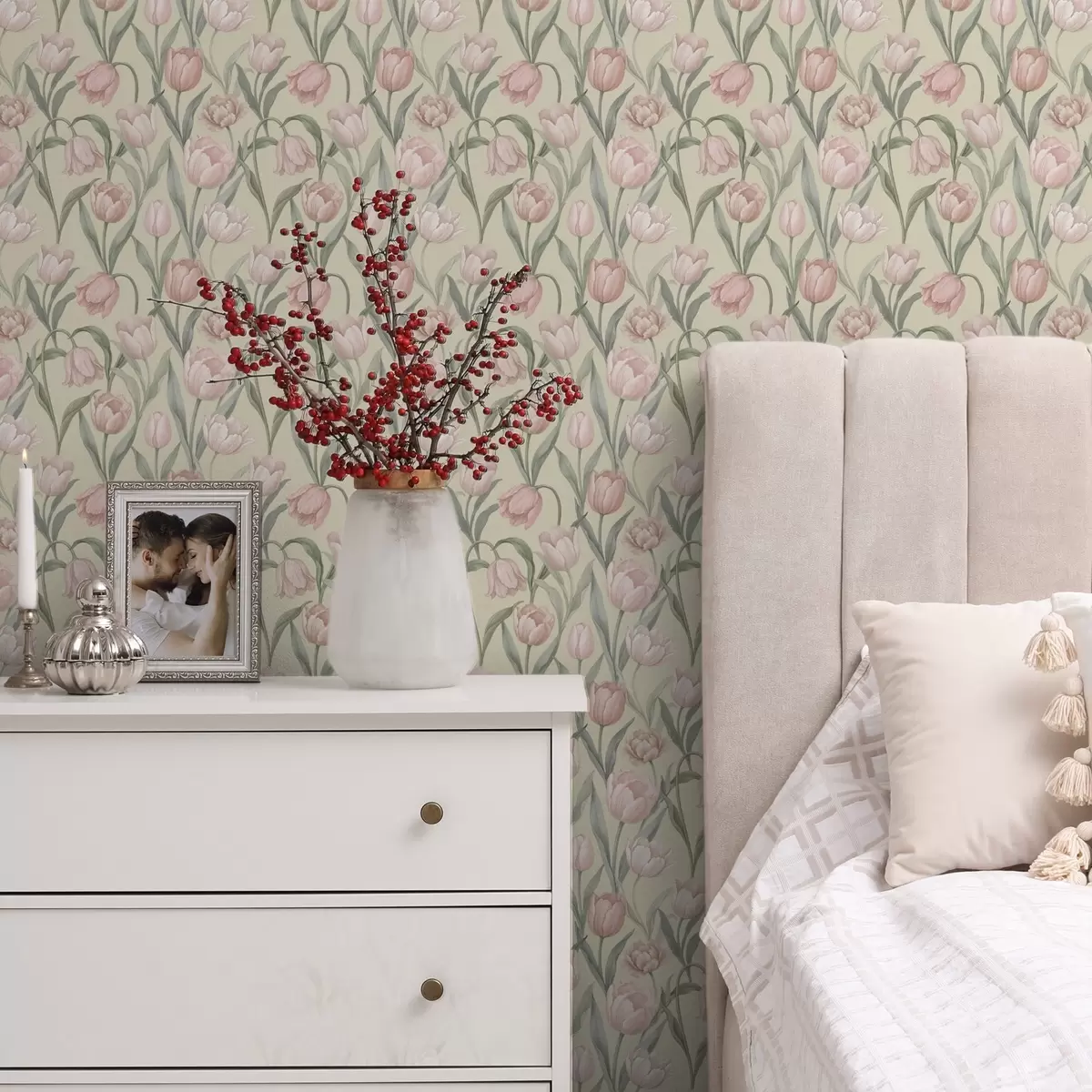 Tapety Delikatne różowe tulipany na jasnobeżowym tle Nr. a00589