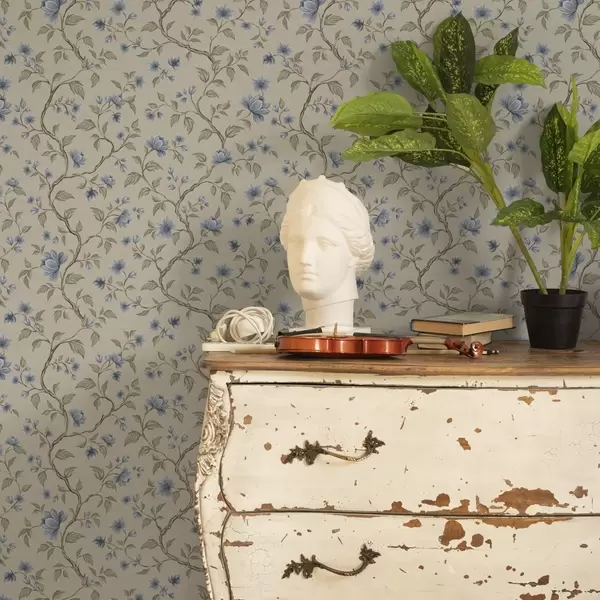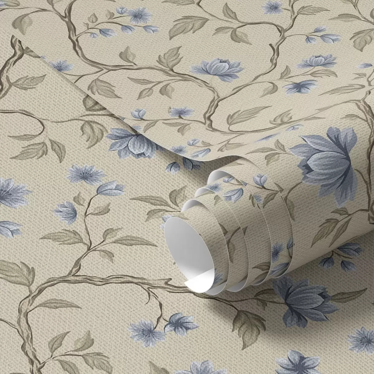 Tapety Niebieskie kwitnące gałęzie na lnianym beżowym tle Nr. a00590