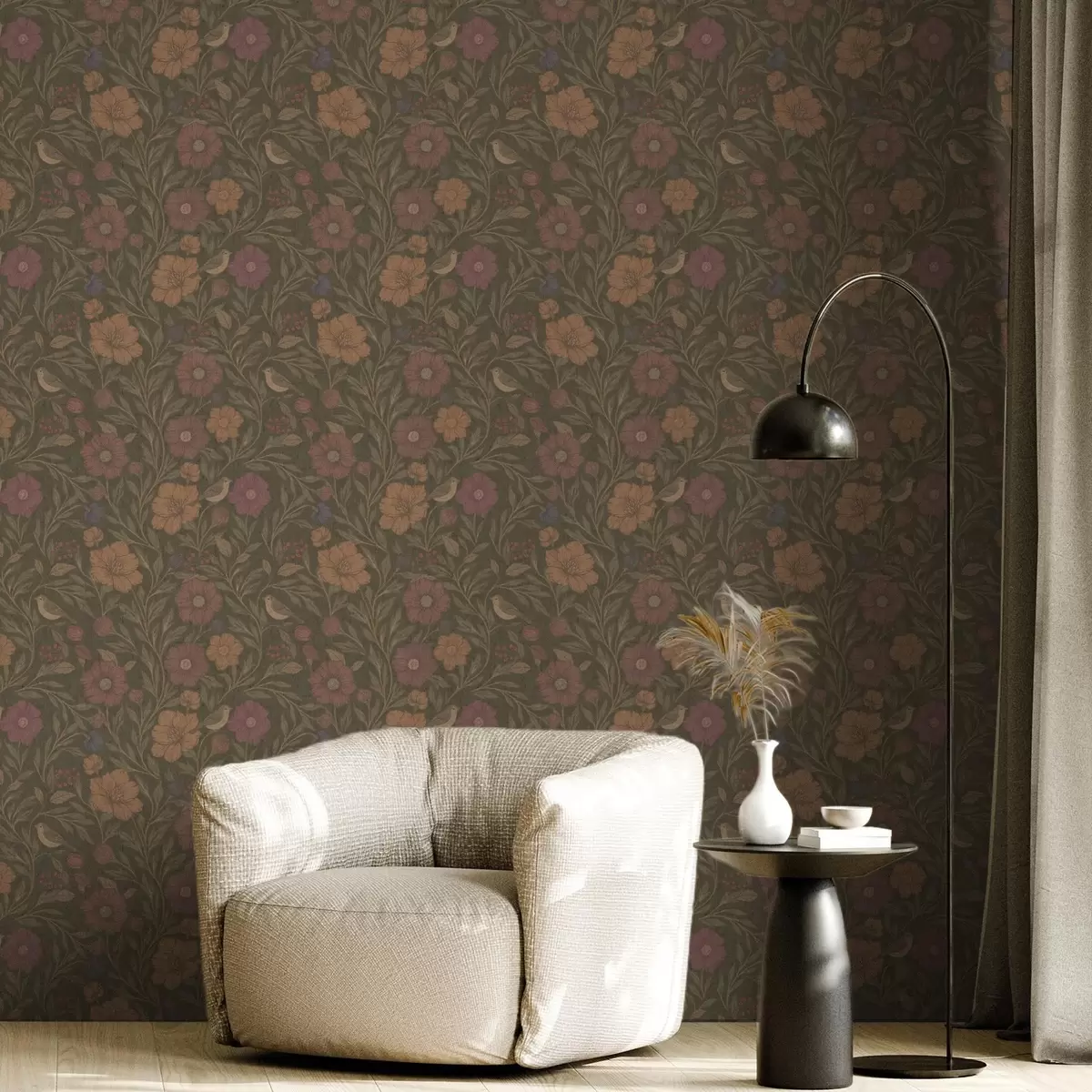 Tapety Jesienne kwiaty i ptaki na oliwkowo-brązowym tle Nr. a00605