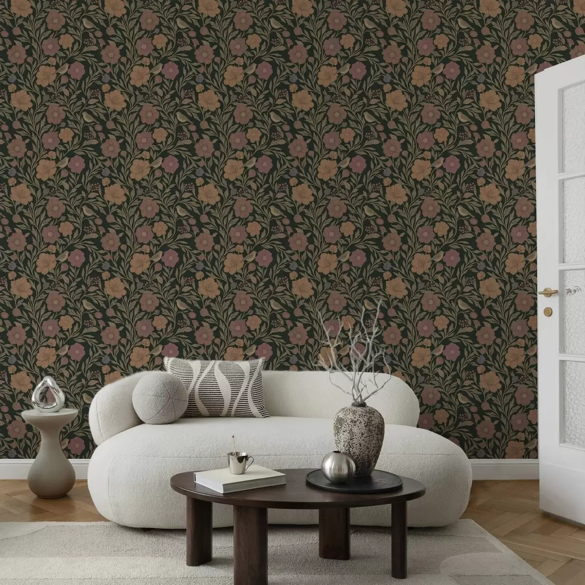 Tapety Jesienne kwiaty i ptaki na ciemnozielonym tle Nr. a00605v1