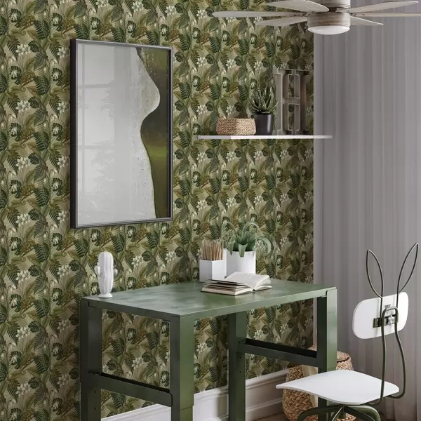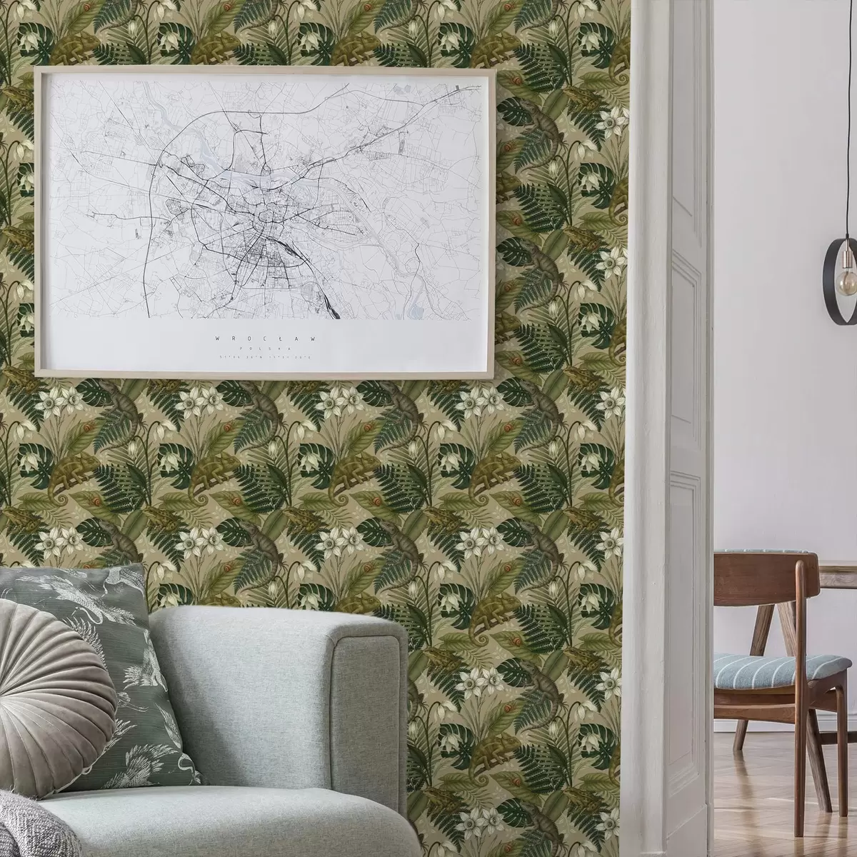 Tapety Kameleony i tropikalne liście, białe kwiaty, beżowe tło Nr. a00608