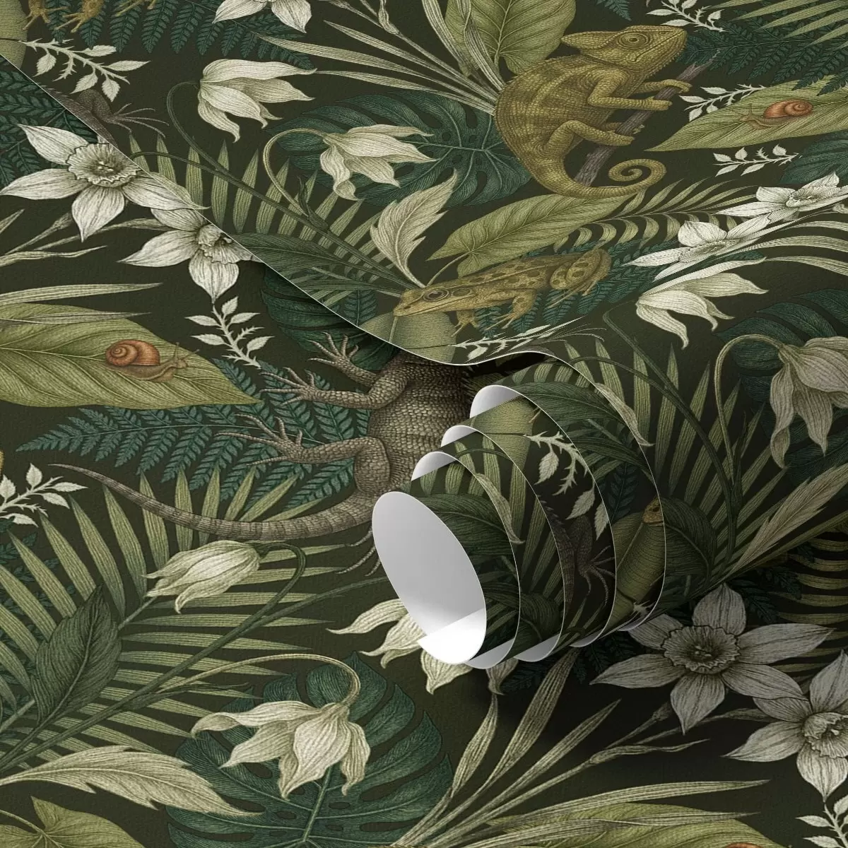 Tapety Kameleony i tropikalne liście, białe kwiaty, ciemne tło Nr. a00608v1
