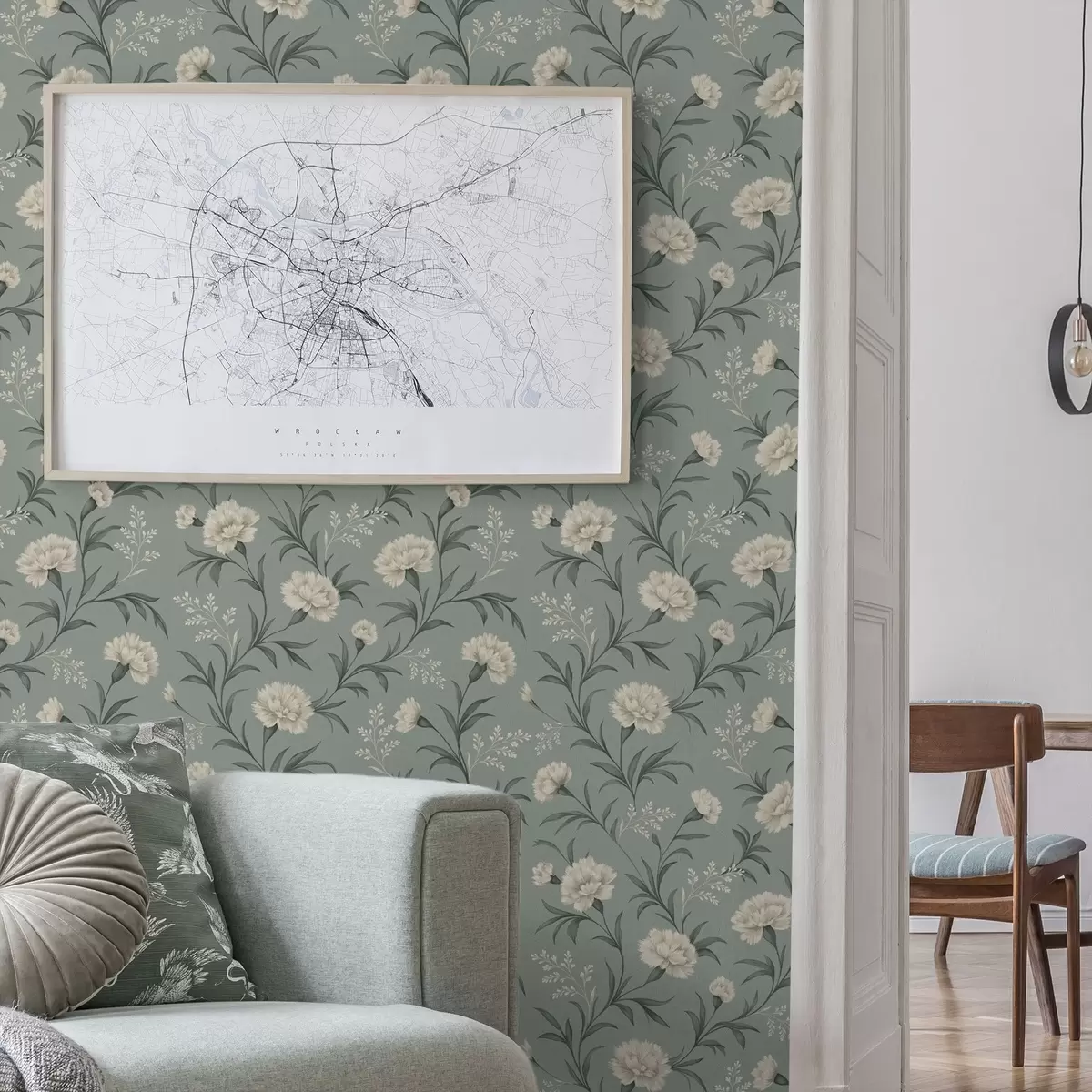 Tapety Pudrowe goździki na szaro-turkusowym tle, wyrafinowany nadruk Nr. a00610