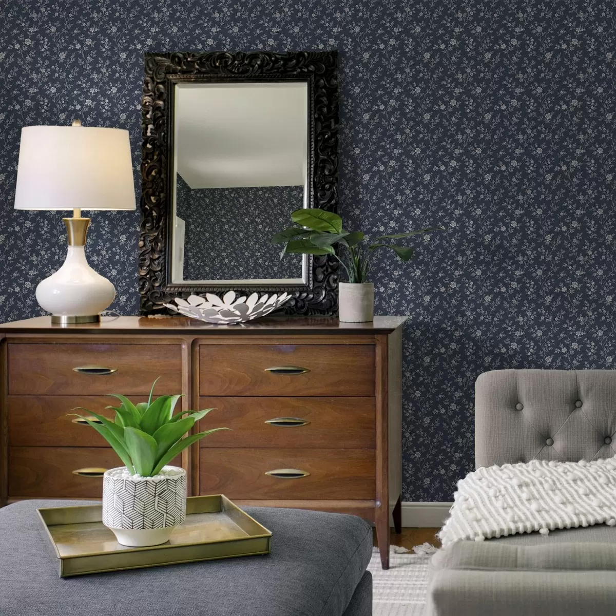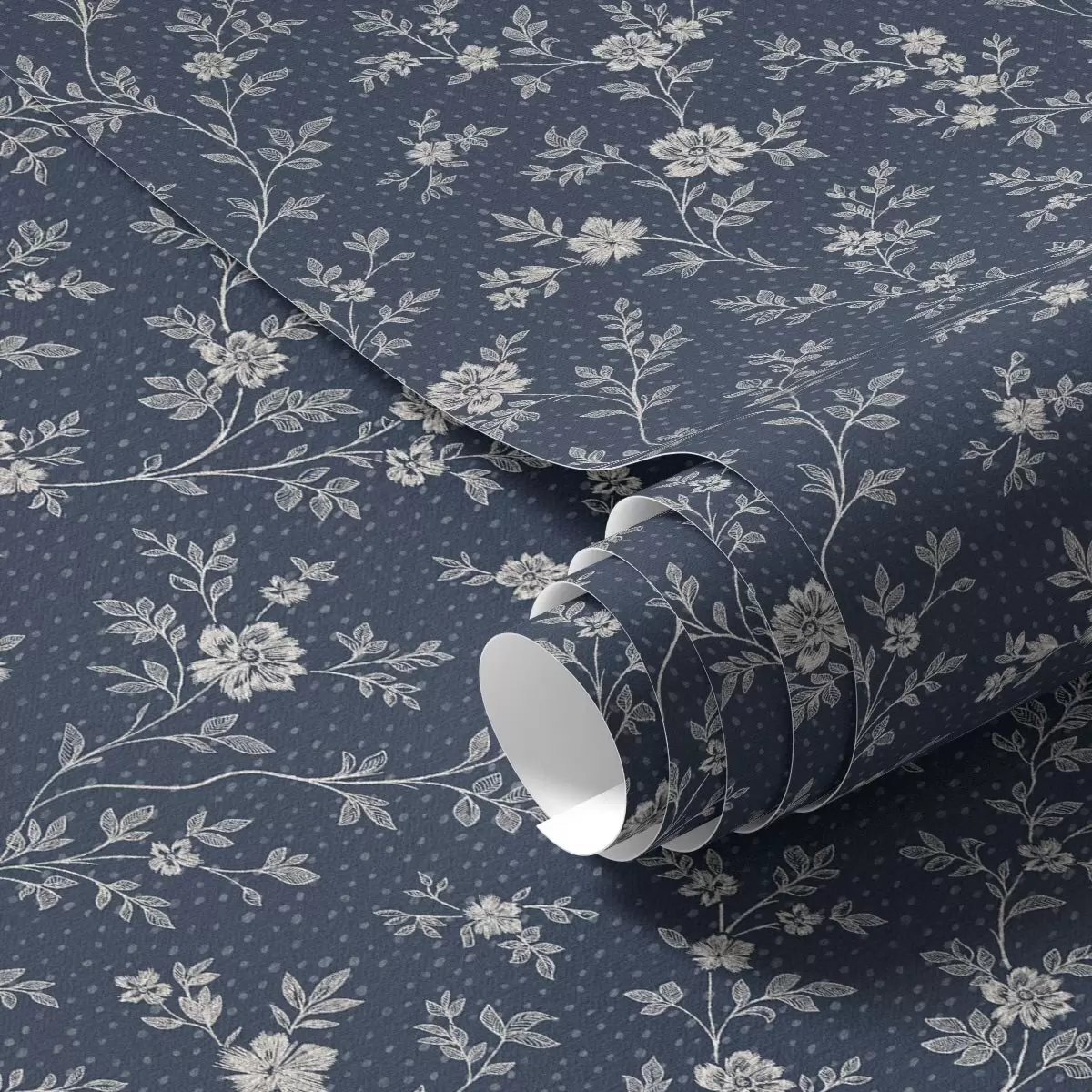 Tapety Ciemnoniebieskie tło z cienkimi beżowymi gałązkami i kwiatami Nr. a00612