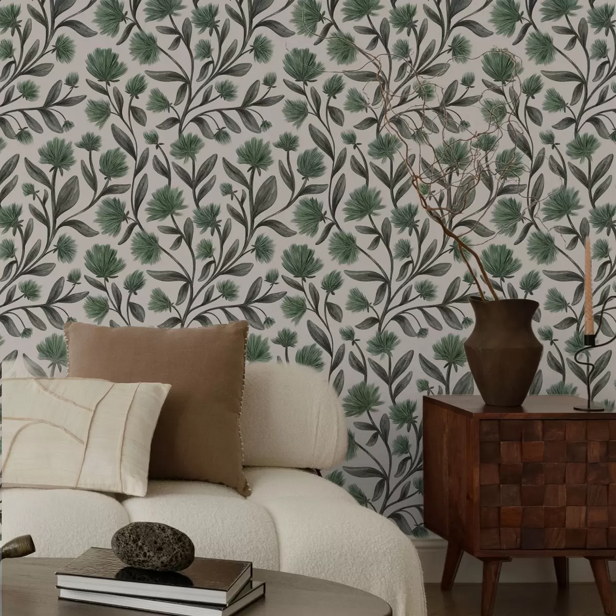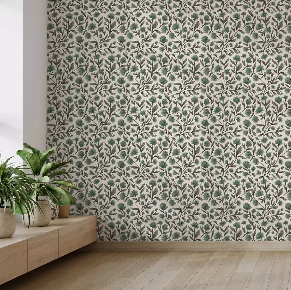 Tapety Kwiaty polne w zielonej palecie na kremowym tle Nr. a00623v3