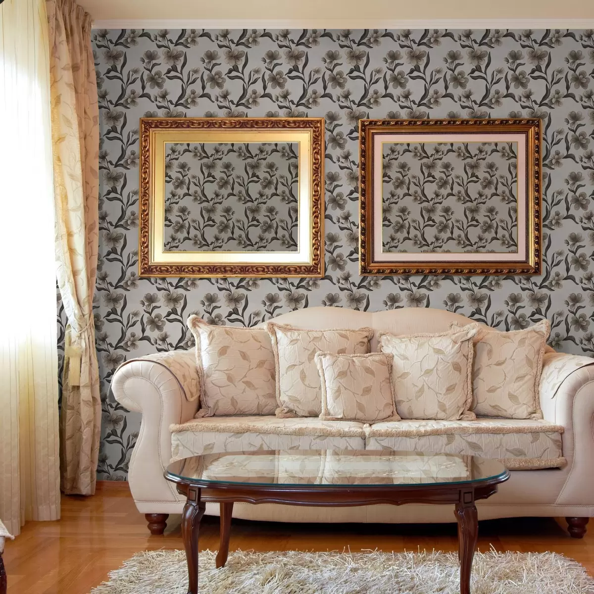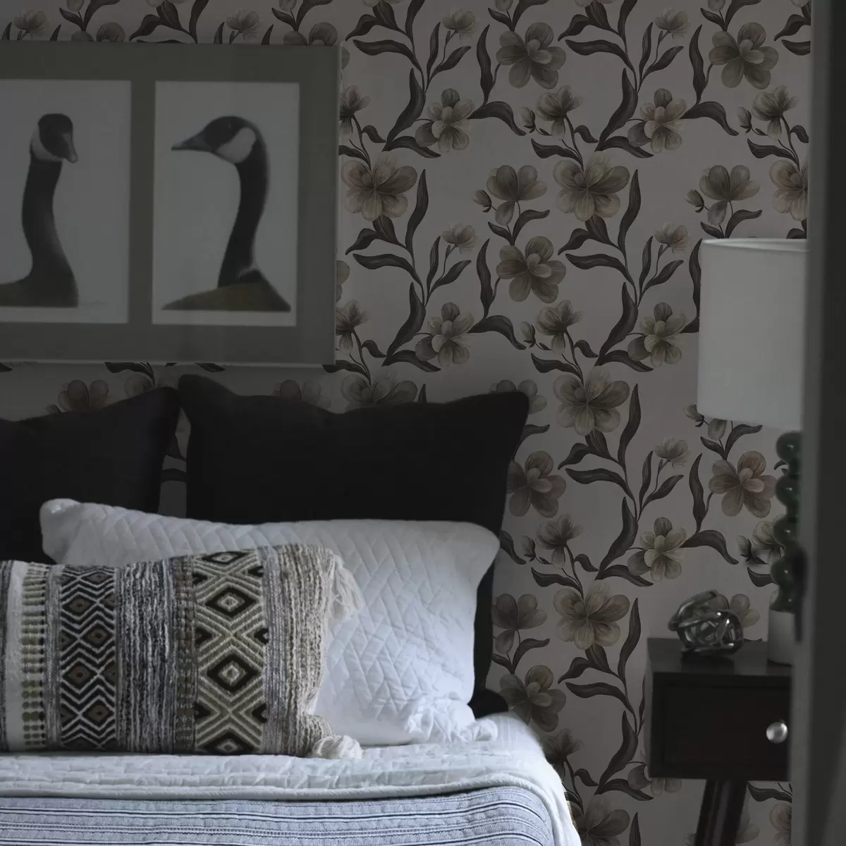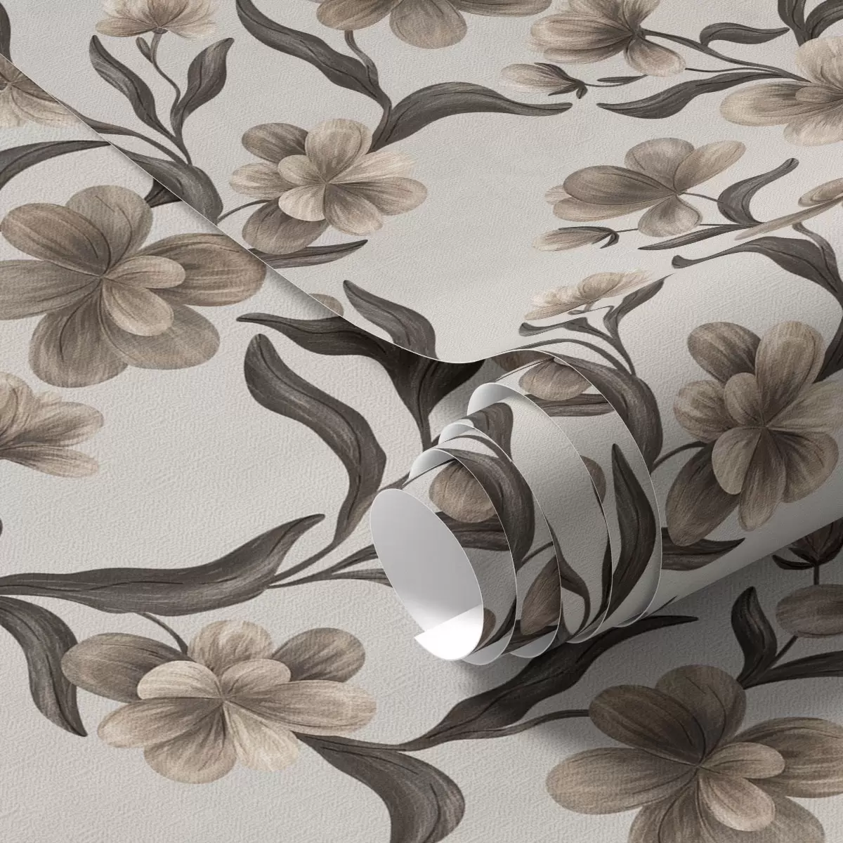 Tapety Beżowe kwiaty i ciemne gałęzie na jasnoszarym tle Nr. a00626v1