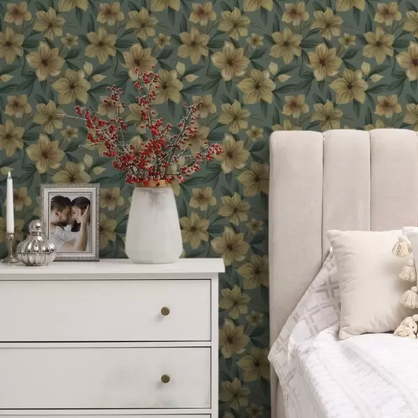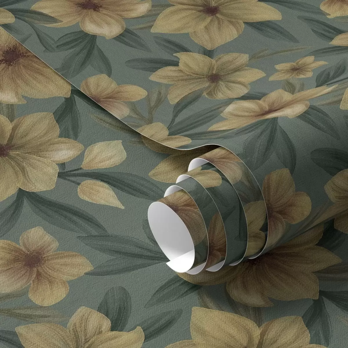 Tapety Kwiaty w kolorze ochry na ciemnozielonym tle, gęsty wzór Nr. a00628