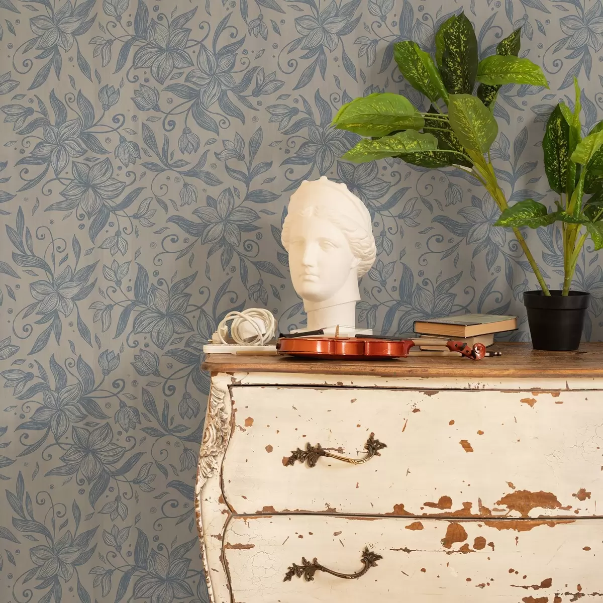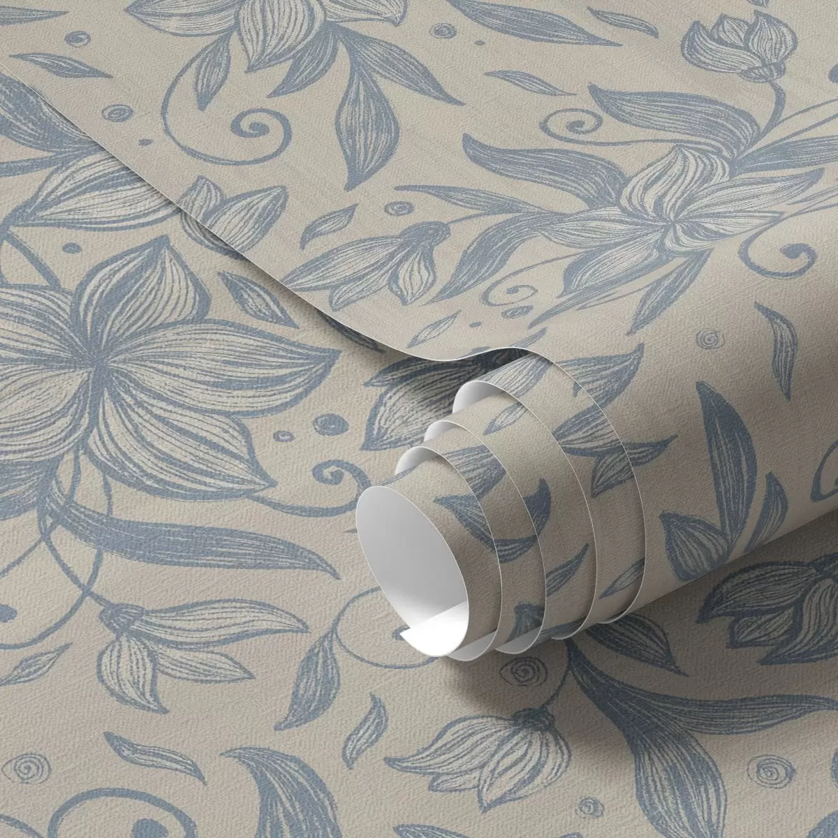 Tapety Niebieski liniowy wzór kwiatowy na ciepłym beżu Nr. a00630v2
