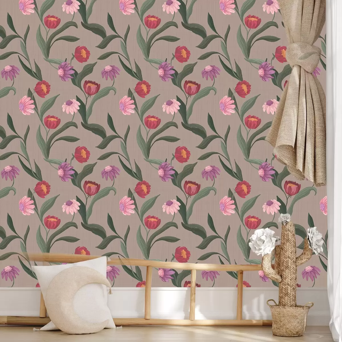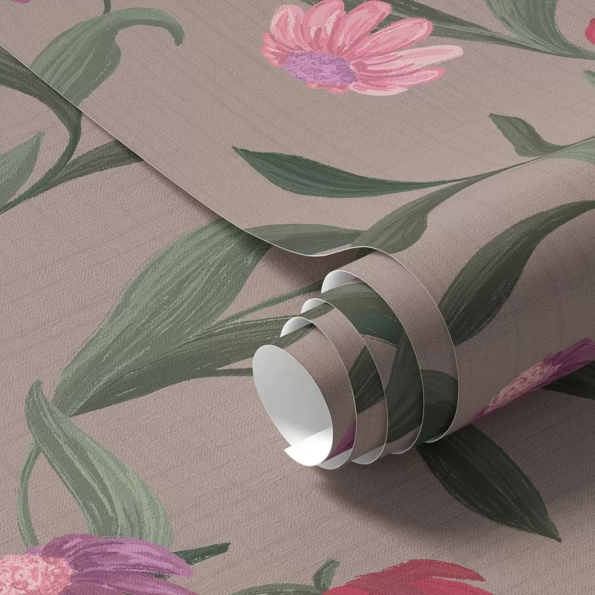 Tapety Różowo-czerwone kwiaty na tle w kolorze taupe, długie łodygi Nr. a00631v2