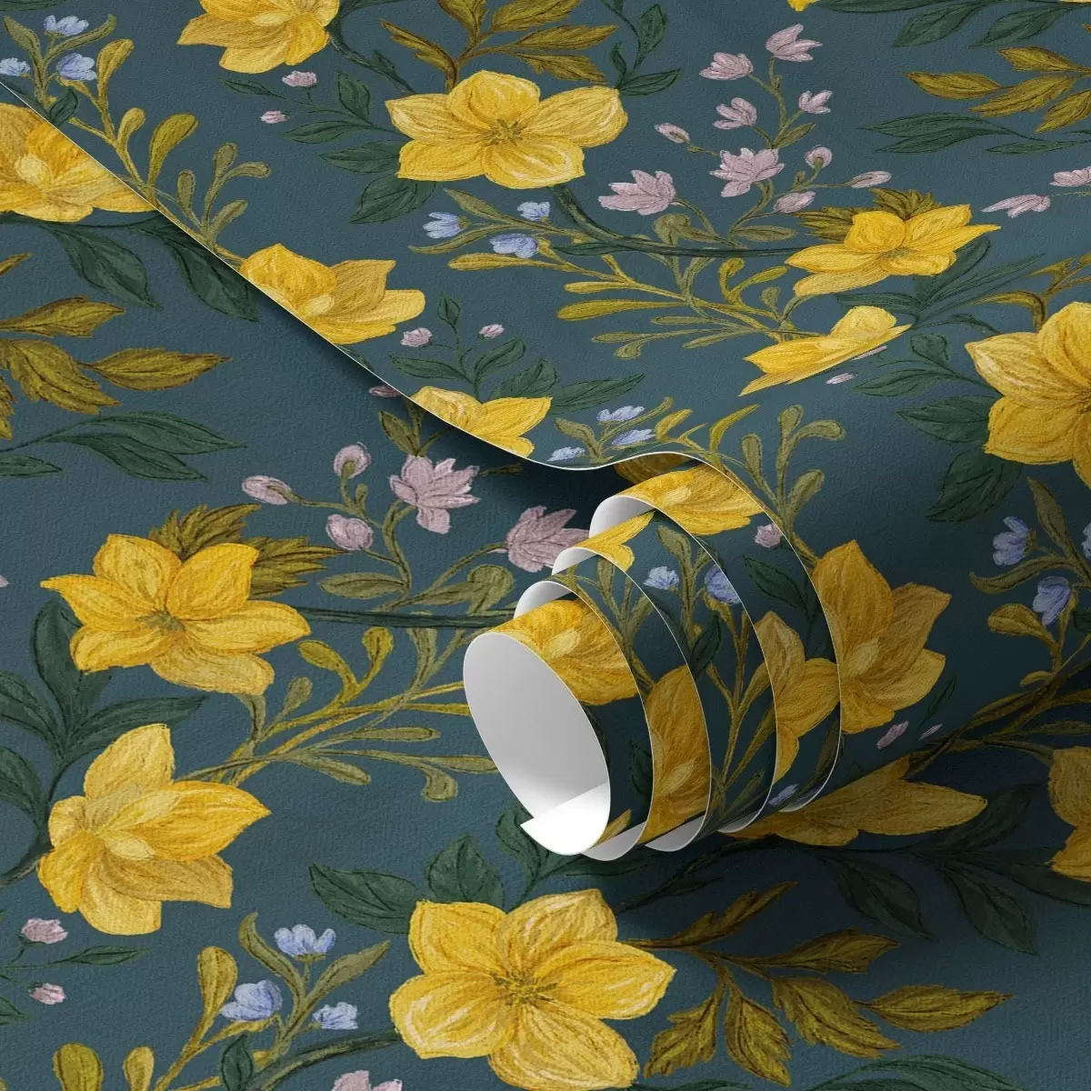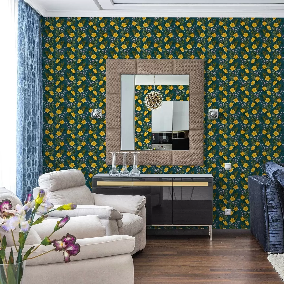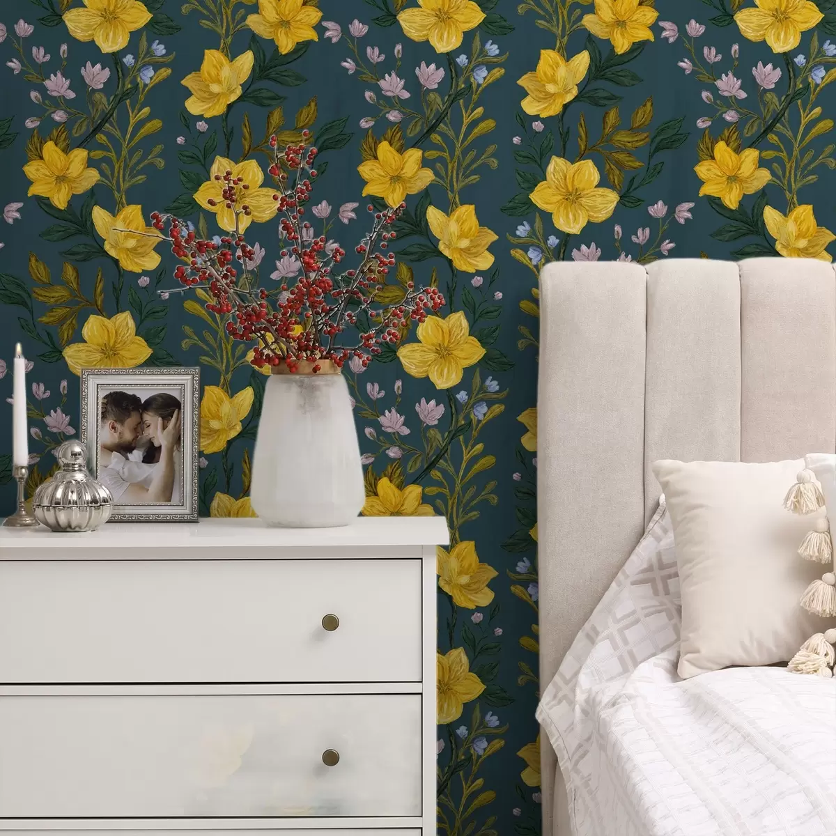 Tapety Żółte kwiaty w pionowych girlandach na ciemnoniebieskim tle Nr. a00632v2
