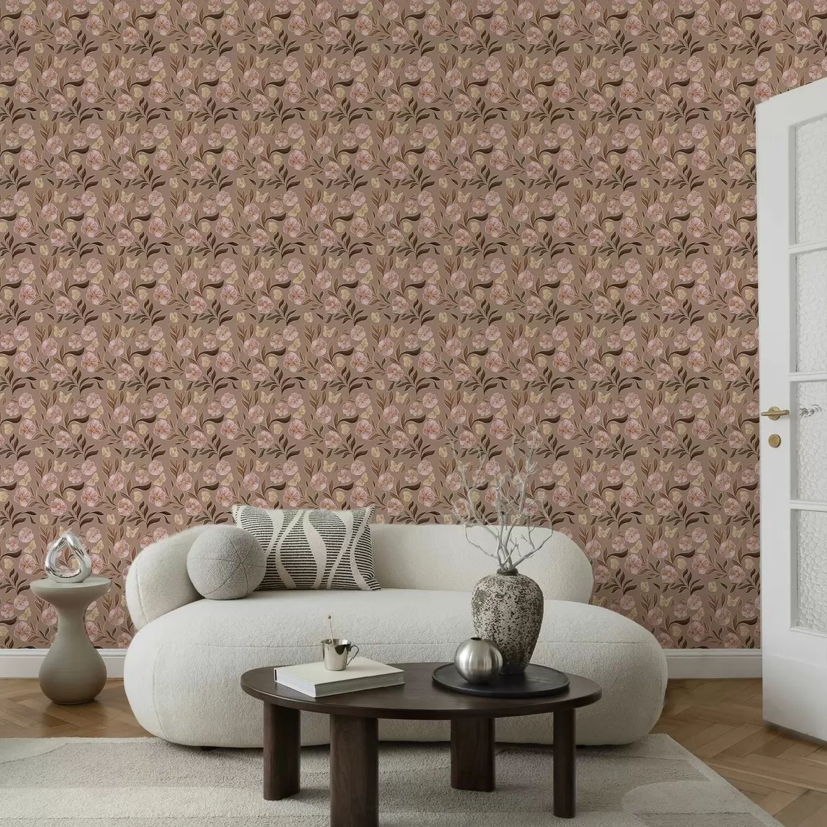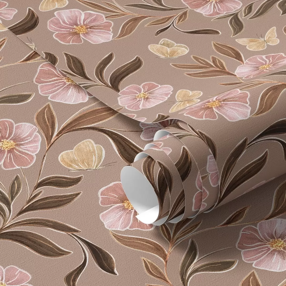 Tapety Różowe kwiaty i motyle na ciepłym brązowym tle Nr. a00633v1