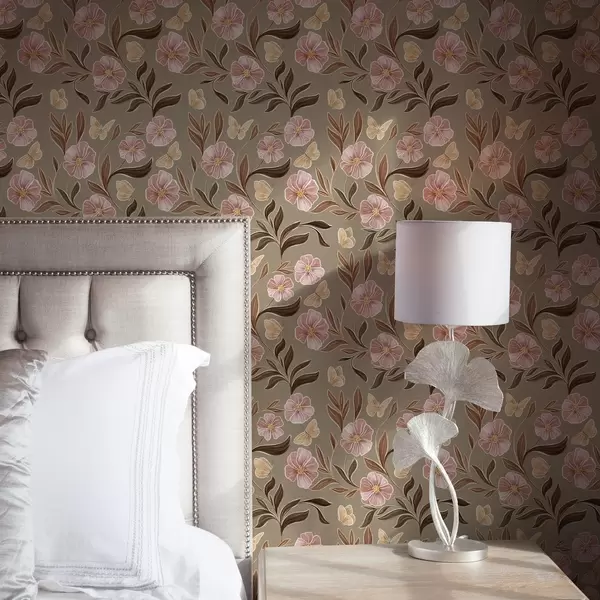 Tapety Różowe kwiaty i motyle na oliwkowo-beżowym tle Nr. a00633v2